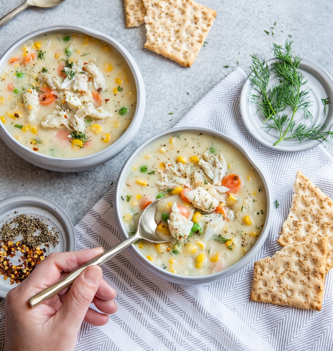 - Add the frozen vegetables, creamed corn, vegetable or chicken stock, dill, garlic powder, and lemon pepper. Heat to a gentle boil.