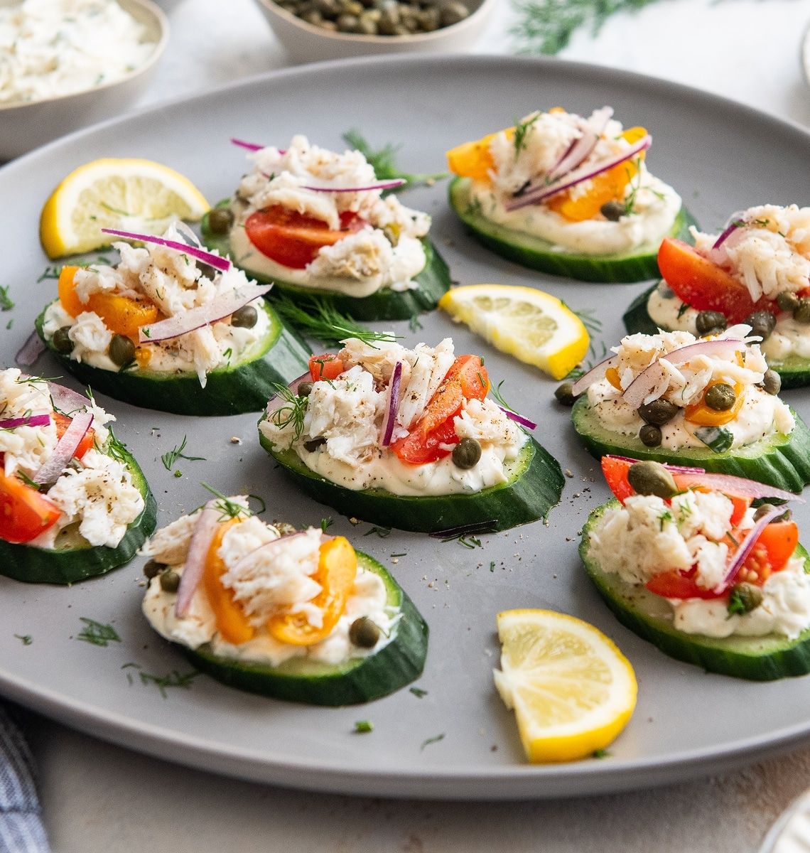- Top with cherry tomatoes, crab, capers, red onion, and chopped dill.