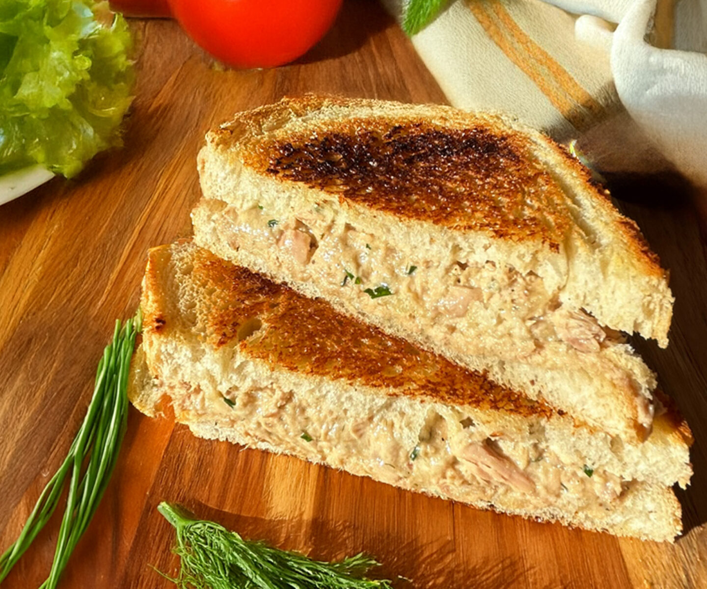 - Spread tuna mixture on top of bread and top with second slice of bread, butter side facing up.