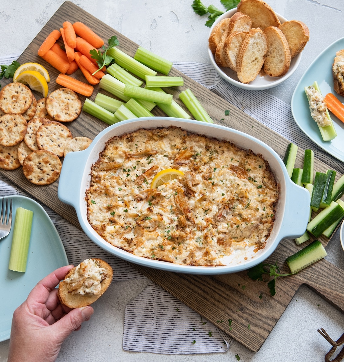6. Serve dip with chips, crackers, bread and/or vegetables. Add a side of lemon wedges if you want if anyone wants to squeeze fresh juice on their serving.